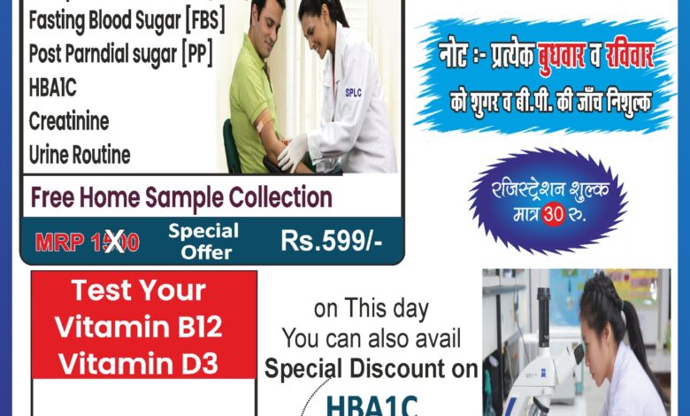 पैथोलॉजी सेंटर द्वारा दिसंबर 2025 के महीने में प्रत्येक बुधवार और रविवार को डायबिटीज यानि शुगर और ब्लड प्रेशर की जांच निशुल्क की जा रही है.